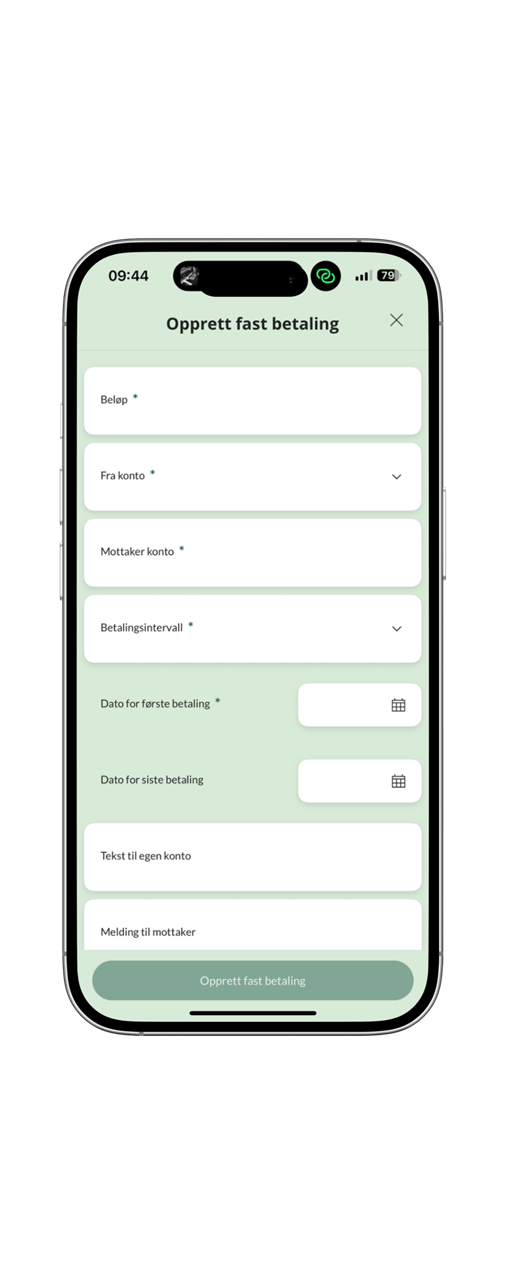 - Trykk på "+" i øverste høyre hjørne og "Opprett fast betaling" vises